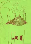 A formai szempontokat tekintve ezen az egyetlen képen rendkívül sokféle tudatállapot látható: a határozott, tiszta vonalvezetésű ház a kisfiú nagy, nyugodt mozdulatait idézi; a kéményekből kanyargó füst játékosságát és a mozdulatok örömét mutatja; a cserepeket ábrázoló vonalak egyenletes távolsága és nagy sűrűsége elmélyült figyelmét, a feladatba való belefeledkezését jelzik; az ablaktáblák homogén színezése alapos, türelmes munkára utal; az ajtón mosolygó arc pedig az alkotás derűjét idézi.